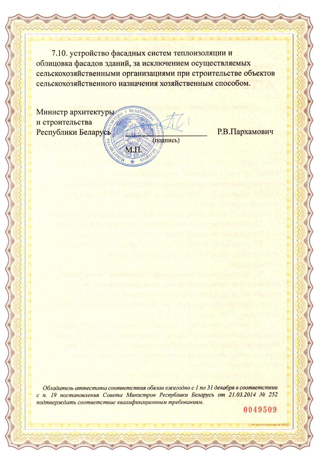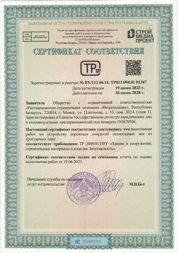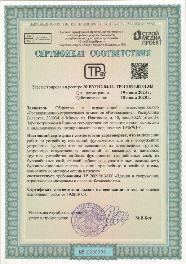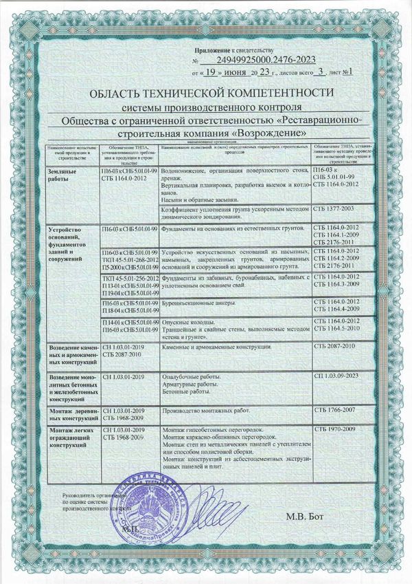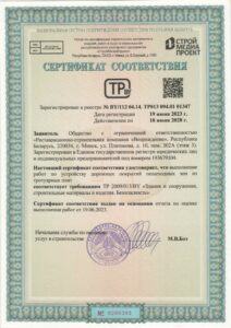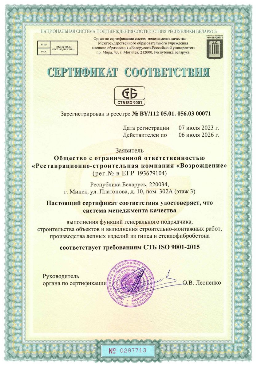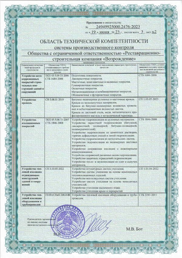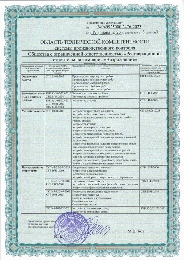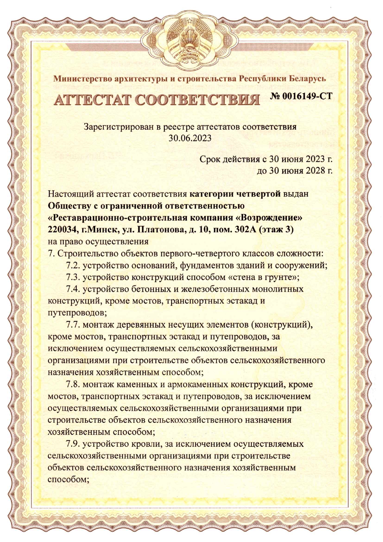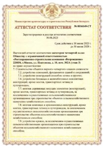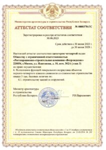 Мы также имеем сертификаты, выданные соответствующими органами Республики Беларусь. Это официальное подтверждение нашей квалификации и способности производить работы по реставрации зданий в соответствии с высокими стандартами и требованиями. Наша компания стремится сохранить и передать наследие прошлого поколениям будущего.